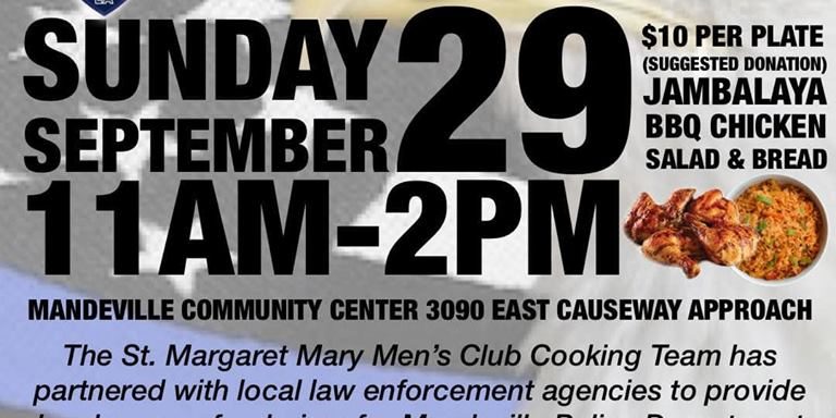 St Tammany United for Mandeville PD is an event this Sunday being hosted by the St Margaret Mary Men’s Cooking Team. This luncheon is a fundraiser for the Mandeville Police Department, being done in conjunction with State Police Troop L, the Sheriff’s Office, Slidell PD, Covington PD, Pearl River RD and others. Florida Marine Transporters is underwriting the cost of the food so 100% of the proceeds will go to the Mandeville Police Foundation. The event is at the Mandeville Community Center on East Causeway Approach, from 11 until 2, this Sunday. Come pick up lunch and show your support for the Mandeville Police Department.